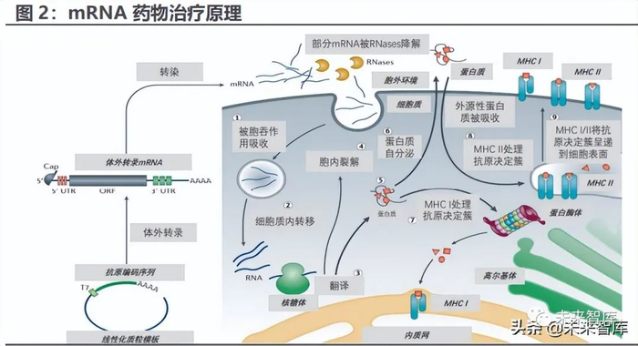 mRNA 药物可以激发人体自身免疫系统,治疗效果显著。mRNA 药物基本 原理是将已修饰的 mRNA 模板注射到细胞质内,在胞内产生对应蛋白产物,分 泌至胞外后可以刺激人体的免疫系统,从而产生免疫反应。该免疫反应主要是通 过在 mRNA 的编码序列中引入分泌信号实现,常规的蛋白无法引起类似反应。