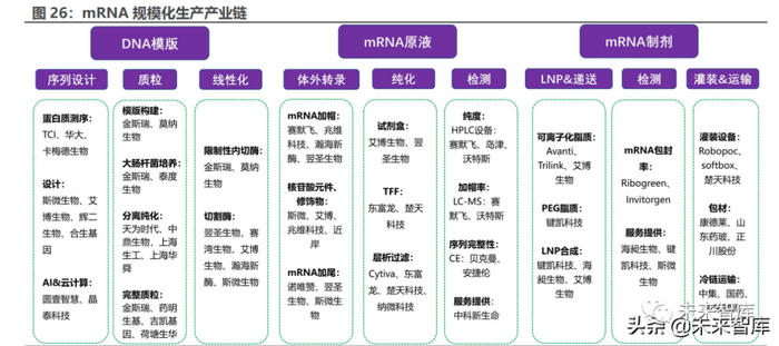 新冠 mRNA 疫苗是人类首次在体外进行超大规模 mRNA 合成与制备并应用 于临床的疫苗,其过程涉及生物、化学、工程等多学科交叉,同时 mRNA 药物 在过程控制、工程保证、大规模制备工艺、质量控制与质量体系等多维度具备复 杂挑战。在面对多方位挑战的同时,对 mRNA 药物进行生产成本控制并构建稳 定的供应链成为其是否能够成功商业化的关键。mRNA 新冠疫苗的广泛关注给 mRNA 研发领域带来的巨大资本投入和时代红利,产业链有望迎来历史性机遇, 国产产业链力量迅速崛起。