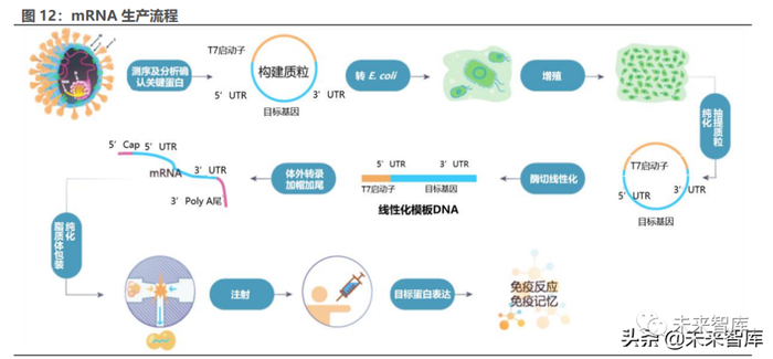 线性化后的质粒片段利用 RNA 聚合酶可以通过体外转录(IVT)合成 mRNA,其主要利用含有 T7 启动子或 SP6 启动子序列的 DNA 为模板,在含有 T7 或 SP6 RNA 聚合酶的条件下,以 dNTP 为底物合成简单快速获得大量的 mRNA 分子,随后在 DNase I 酶降解 DNA 模板及纯化后,通过在 5’端加上帽 子结构和 3’端加 ployA 尾加强 mRNA 的稳定性。
