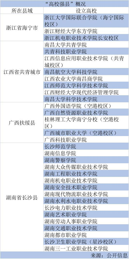 徐军伟统计发现,当时浙江省108所普通高校中,有42所高校(含分校区)落户县域(包括非中心城区的区),占38.8%;当时江苏省普通高校166所中,有35所高校落户县域,占21.1%。
