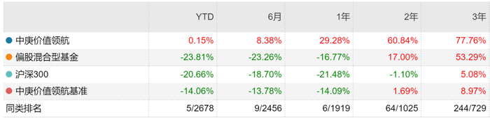 以其在中庚最早发行的产品中庚价值领航为例,今年来还是赚钱的。最近半年还赚了超过8个点,近一年收益率近30%,这在一众公募明星基金经理被市场“揉戳”的痛苦里,业绩不仅仅能用亮眼形容。