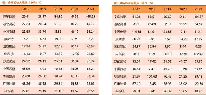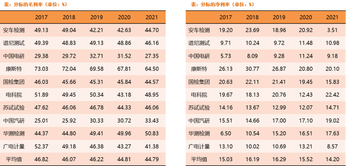 净利率:21行业平均水平为14.20%,其中电科院、康斯特、中国汽研、华测检测表现优秀。