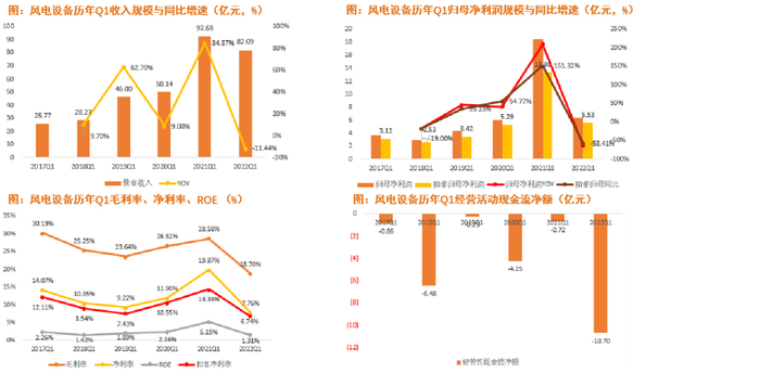 风电设备:板块21Q4及22Q1普遍承压,21年行业整体小幅增长,22年Q1同比下降;盈利能力整体水平同比下滑;我们认为主要系行业抢装周期导致高基数,看好具备“通胀”能力的环节。