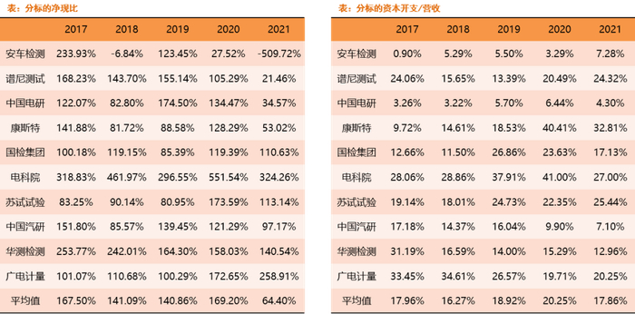 资本开支/营收:行业平均资本开支/营收为17.86%,其中谱尼测试、康斯特、电科院、苏试试验以及广电计量高于行业平均水平。
