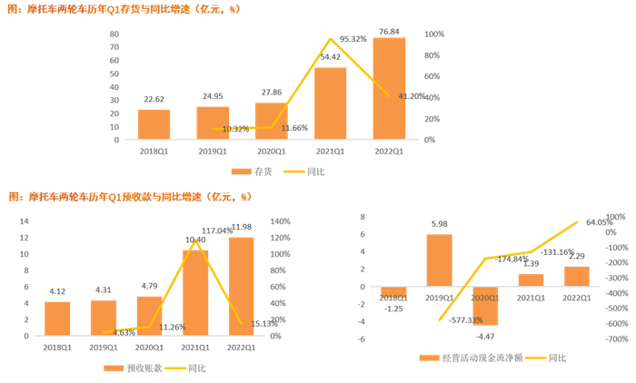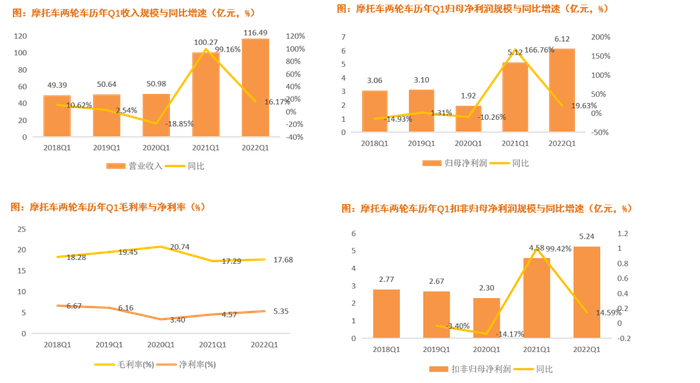 收入利润方面,2022年Q1摩托车两轮车板块板块收入116.49亿元,同比增加16.17%;归母净利润6.12亿元,同比增加19.63%,扣非归母净利润5.24亿元,同比+14.59%。