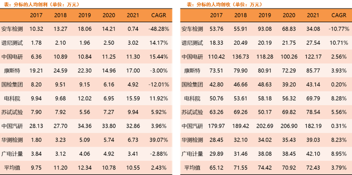 人均创收:21年行业均值为72.43万元,中国汽研与中国电研远高于行业平均水平,主要原因系检测领域集中带来的规模效应;从2017-2021年的CAGR来看,谱尼测试、广电计量电科院以及华测检测高于同行水平。