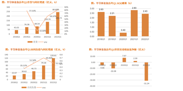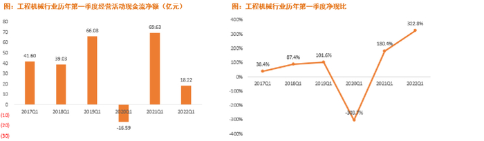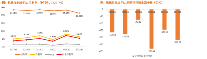 现金流方面,2022年Q1板块经营性活动现金流为-217.09亿元,较2021年Q1的-144.51亿元净流出有所加剧,伴随近期国内疫情缓解,重大项目开工提振采购信心,我们预计机械行业预期边际有望改善。