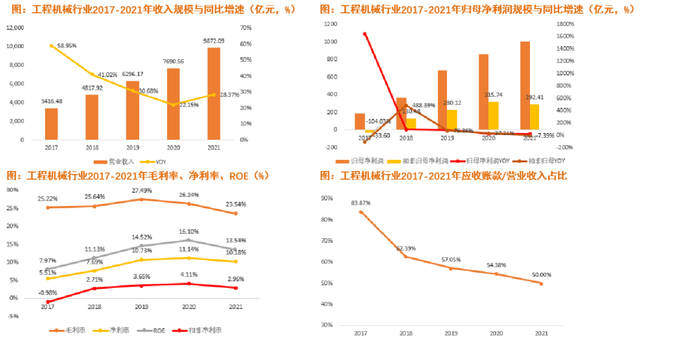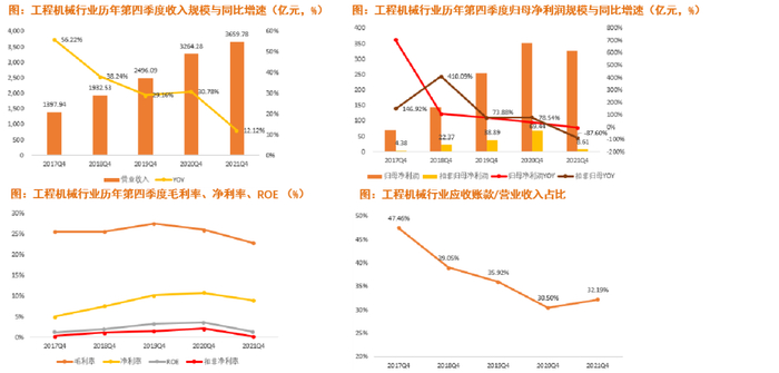 2021年全年工程机械板块收入9872.09亿元,同比+28.37%;归母净利润1005.34亿元,同比+17.35%;扣非归母净利润292.41亿元,同比-7.39%。全年毛利率23.54%,同比-2.70pct;净利率10.18%,同比-0.96pct,扣非净利率2.96%,同比-1.15pct,ROE为13.54%,同比-2.56pct;2021年应收账款/营业收入为50.00%,同比-4.38pct,为近五年来的最低点。