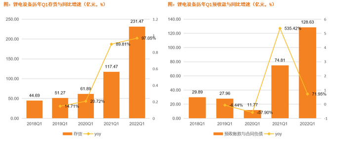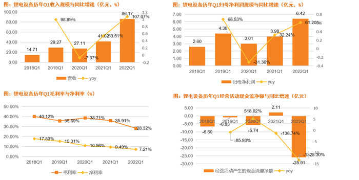 锂电设备:景气度环比提升,22年Q1收入增速高于去年全年;21年盈利能力有所下行,行业整体毛利率有所下降;我们计算发货值用以衡量包含未确认收入的总体商品价值,增速高达82%,高于收入增速。