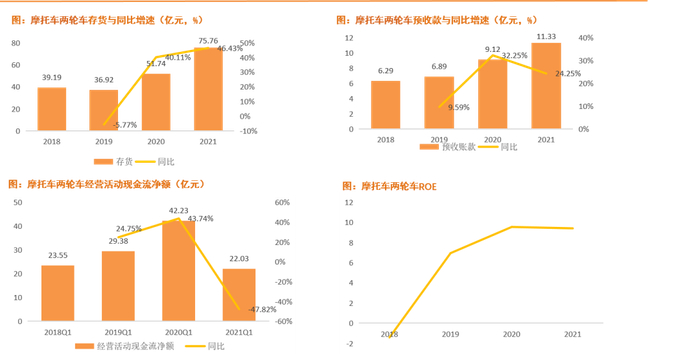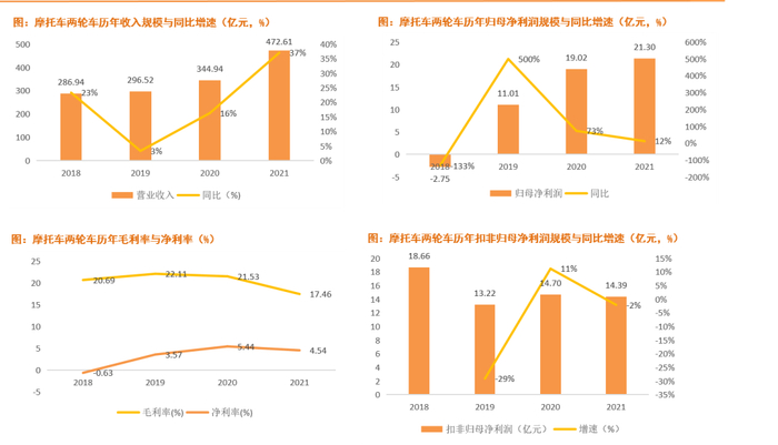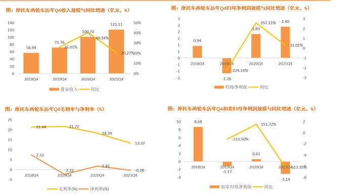 收入利润方面,2021年Q4摩托车两轮车板块板块收入121.11亿元,同比增加20.27%;归母净利润2.4亿元,同比增加31.03%,扣非归母净利润-3.14亿元。