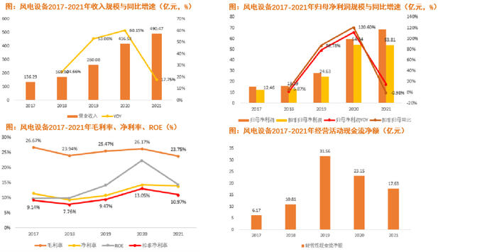 2021年风电设备板块收入490.47亿元,同比增加17.75%;归母净利润68.32亿元,同比+15.33%;扣非归母净利润53.81亿元,同比下降0.98% 。综合毛利率为23.75%,同比下降2.42pct,净利率为13.93%,同比下降0.29pct,扣非净利率为10.97%,同比下降2.08pct,ROE为14.46%,同比下降8.18pct。实现经营性现金流净额17.63亿元,占同期收入的比例为3.59%,较2021年现金流状况同比有所下滑。
