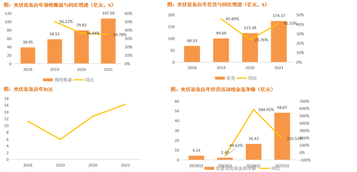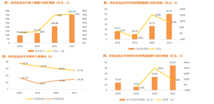 收入利润方面,2021年光伏设备板块收入351.49元,同比增加71.63%;归母净利润50.31亿元,同比+92.56%;扣非归母净利润44.35亿元,同比+86%。