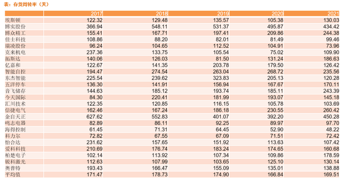 存货周转率:周转效率方面,21年行业平均水平为170天,与往年基本维持同等水平。其中瑞凌股份、亿嘉和、东杰智能的周转率明显提升。
