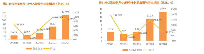 收入利润方面,2022年Q1光伏设备板块收入127.94亿元,同比增加92.91%;Q1归母净利润14.67亿元,同比+31.83%,扣非归母净利润16.93亿元,同比+29.6%。