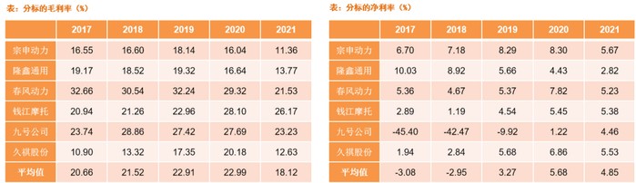 净利率:21行业平均水平为4.85%,其中宗申动力、春风动力、钱江摩托、久祺股份高于行业平均水平