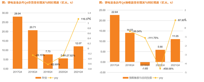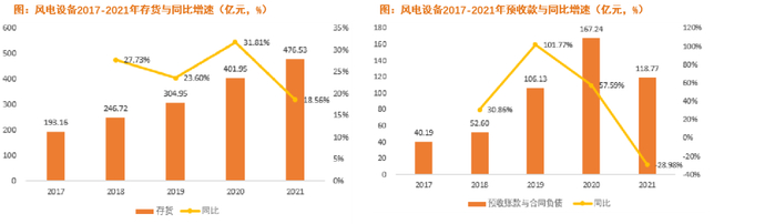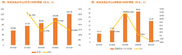 存货和预收款方面,2021年第四季度风电设备板块存货为121.33亿,同比增加14.59%;预收账款(合同负债)为25.40亿,同比下降31.20%。