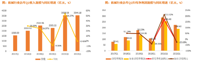 2022年一季度机械行业收入同比小幅下滑,归母净利润在去年高基数下回落明显:2022年Q1机械行业实现总收入3544.18亿元,同比-0.40%;归母净利润方面, 2022年Q1实现归母净利润223.65亿元,同比-22.39%;扣非归母净利润190.60亿元,同比-25.68%。面临原材料价格上涨、供应链紧张、排放升级等诸多不确定因素,今年一季度机械行业仍处调整周期;去年年底中央经济工作会议明确提出适度超前开展基础设施投资战略举措,我们预计今年机械行业将呈现“前低后高”的态势,国际化空间、技术周期以及行业的智能化、电动化或将大幅拉伸行业空间。