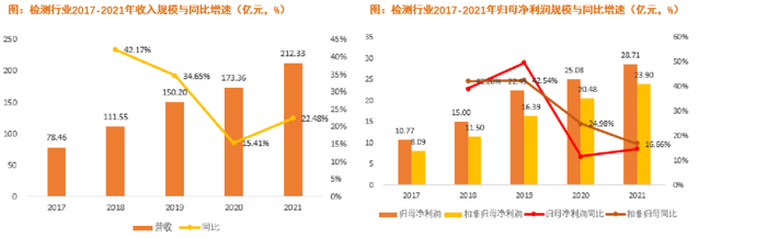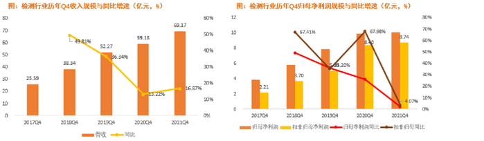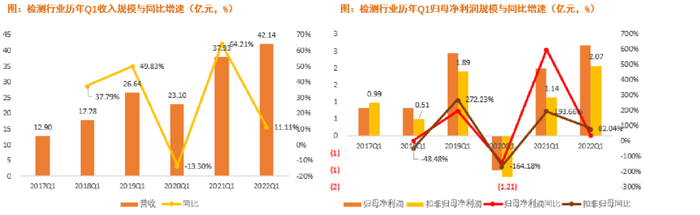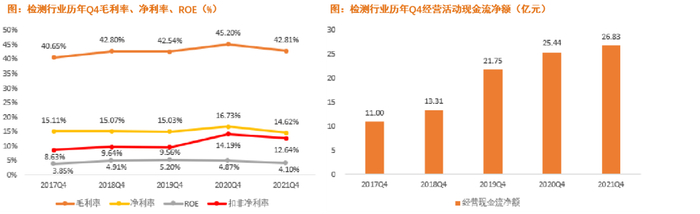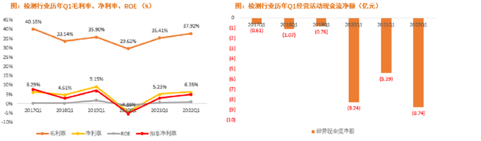 检测板块:21年全年板块整体营收和净利均同比增加,但盈利能力有所下降,22年Q1开始明显改善,整体毛利率、净利率分别同比增加2.51pct、1.12pct。从头部企业财务数据来看行业盈利水平较强,仍处于上升期,同时部分细分板块仍有望保持较高行业增速。