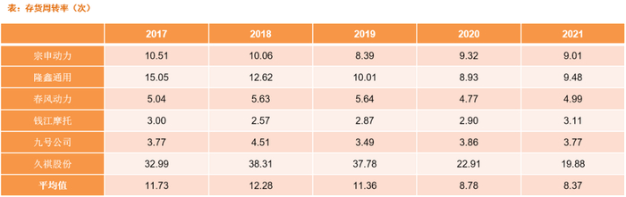 存货周转率:21年行业平均水平为8.37次。其中久祺股份周转率显著高于行业平均水平。