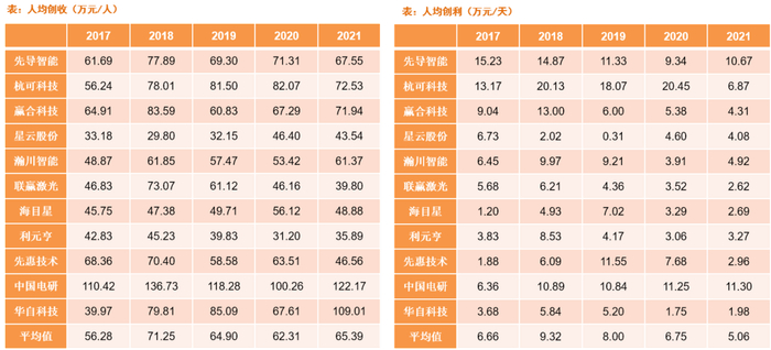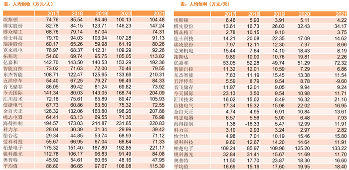 人均创利:21年行业均值为5.06万元,表现优秀的为中国电研与先导智能。