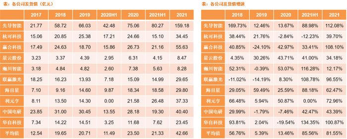 发货值:我们用发货值来衡量未确认收入的总体商品价值(计算原理为:将原材料中发出商品部分减去该部分计提的减值损失,其值除以1-毛利率,来计算发出商品对应的市值,在加上当期收入后)。21年行业的平均值为42.66亿元,先导智能远超行业平均水平达到159.18亿元。21年下半年,先导、杭可、赢合涨幅较快,全年行业平均增速为81.55%,先导仍处在领先水平。(先惠技术未披露相关数据,利元亨未披露20年半年报相关数据)