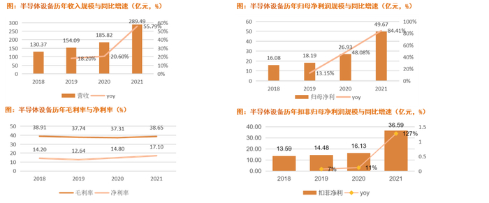 半导体设备:2021年板块整体规模与盈利能率均有提升,全年收入增幅超50%,归母净利润同比增长84.41%;综合毛利率与净利率分别同比增加1.34pct、2.30pct。2022Q1年半导体行业资本开支继续处于高位,行业营收保持稳健增长,但是因为收到华东地区疫情的扰动,导致设备交付以及收入确认节奏减缓。