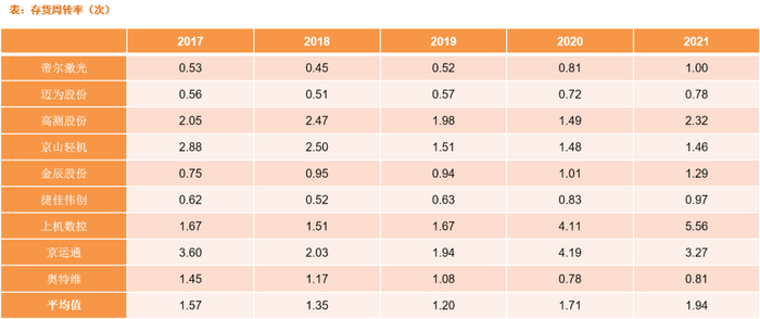 存货周转率:21年行业平均水平为1.94次。其中上机数控、京运通周转率显著高于行业平均水平