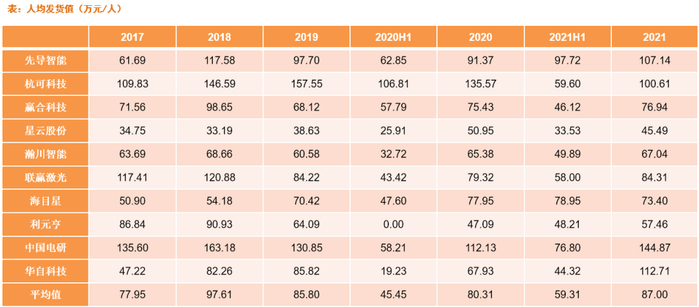 人均发货值:以人均发货值衡量人均产出,21年全年行业平均水平为87万元,相较于20年有明显提升的为先导智能、中国电研、华自科技等,且均高于行业平均水平。