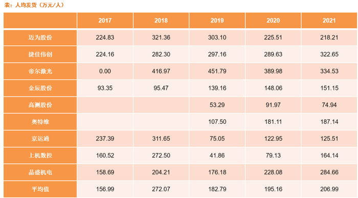 人均发货:2021年,人均发货超过均值的有:帝尔激光、捷佳伟创、晶盛机电、迈为股份。