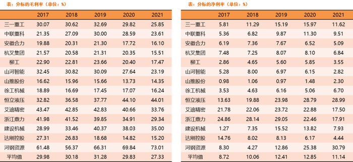 毛利率:21年行业平均水平为27.33%,其中河钢资源、恒立液压、建设机械、艾迪精密、浙江鼎力高于行业平均水平。
