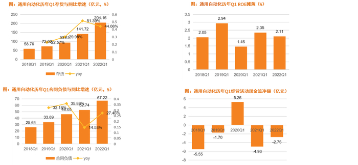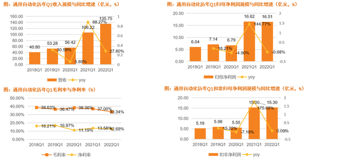收入利润方面,2022Q1通用自动化板块收入135.75亿元,同比+27.79%;2022 Q1年归母净利润16.51亿元,同比-0.61%; 2022 Q1年扣非归母净利润15.30亿元,同比0%;