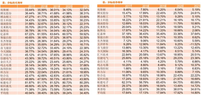 毛利率:21年行业平均水平为34.40%,其中亿嘉和、柏楚电子、奥普特显著高于行业平均水平;