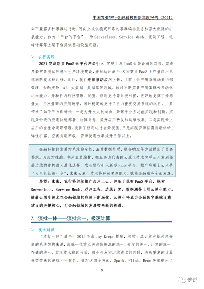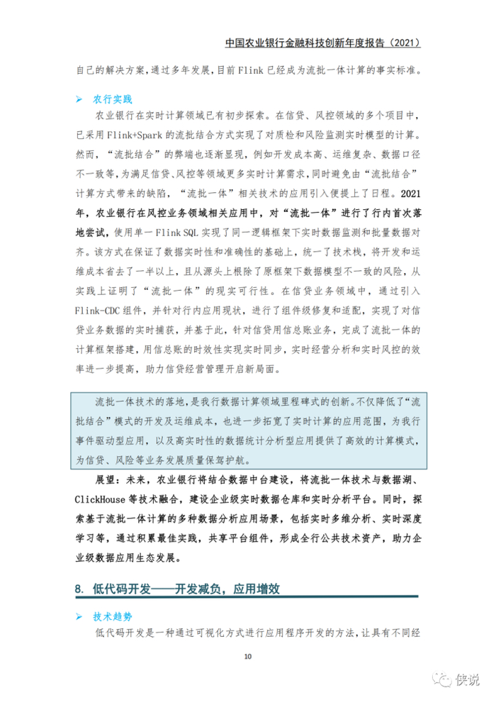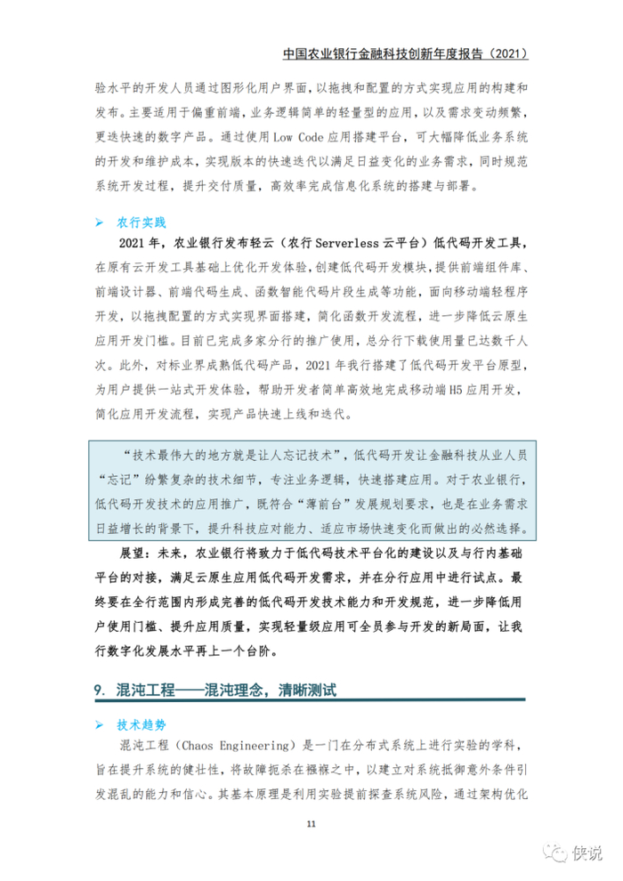 科技支撑方面,在云原生、流批一体化、低代码开发、混沌工程和AIOps 5个领域发力。云原生技术逐步重构信息系统应用架构及软件研发体系;流批一体化计算首次在农业银行“烽火平台”落地,拓宽了实时化数据处理的应用范围;低代码开发、混沌工程和AIOps通过新工具研发、新平台建设等一系列试点工作,全面赋能开发、测试、运维3个应用研发环节,保障了业务需求的响应速度和软件质量。