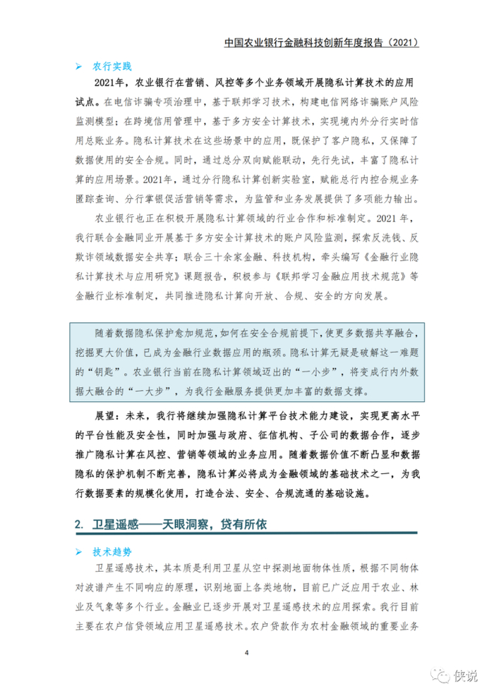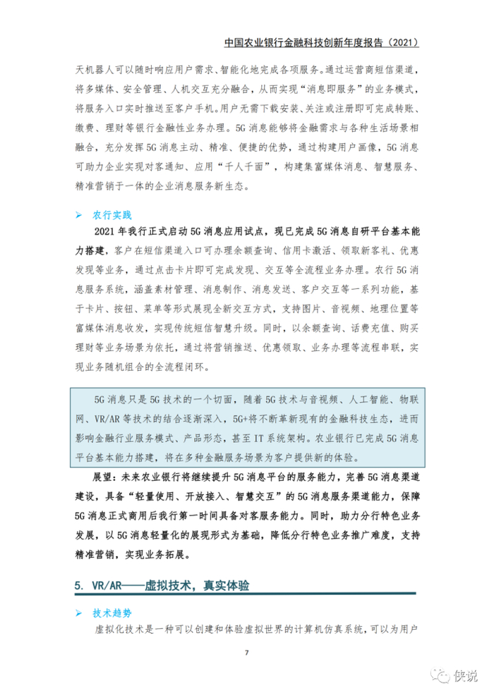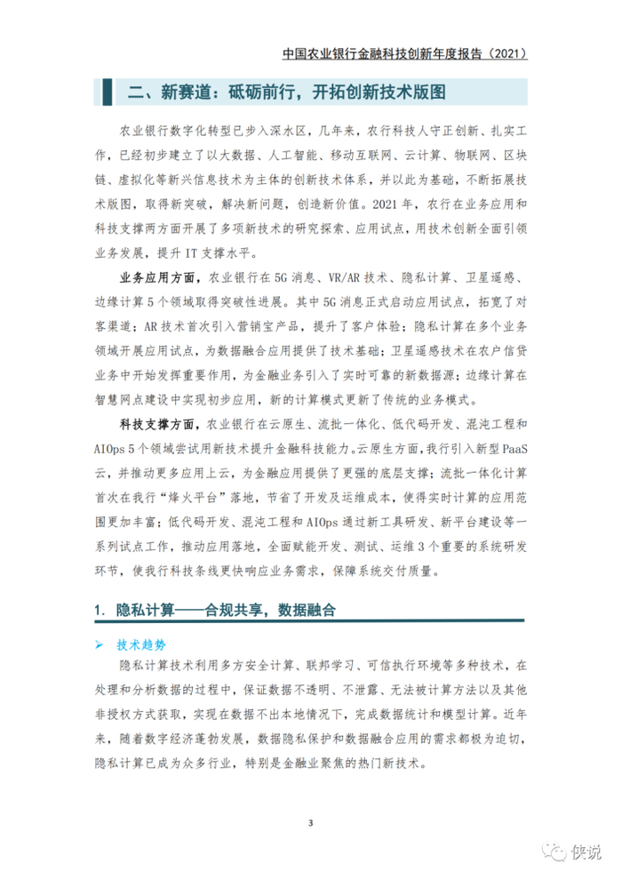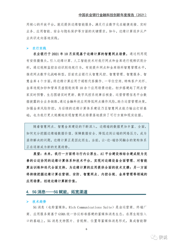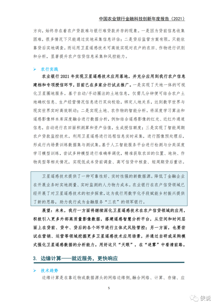 业务应用方面,在5G消息、VR/AR技术、隐私计算、卫星遥感、边缘计算5个领域取得突破性进展。5G消息带来了新的银客交互入口;AR技术首次引入营销宝产品,提升了客户体验;隐私计算为数据融合,释放更大价值应用提供了技术基础;卫星遥感技术破解了农户信贷业务中的一列系难题;边缘计算打造了新的技术模式,优化了经营管理质效。
