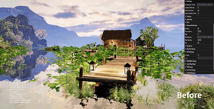 而屏幕空间内GodRay/LightShaft和用来增强阴影细节的SSAO技术,同样凸显了其低耗高效的特点。先将天空盒上的亮度作为信息,在预处理阶段计算出一张明暗贴图,然后剔除掉被遮挡的部分,以光源位置为中心作径向模糊效果,最后叠加到光照结果上。SSAO技术则能计算出画面中任意一点被周围几何体遮挡的百分比,然后根据遮挡的部分计算需要的阴影数量。从原理上理解光影结构,才能用技术手段去还原现实场景,凭借有限的资源占用来实现最大化的渲染效果。