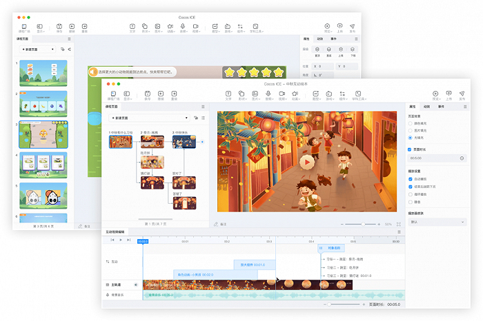 另外,同样是因为Runtime这样高效高兼容的架构,Cocos 在在线教育也构建了绝对的优势,众多在线教育机构使用 Cocos 来做互动小游戏、简单动画演示等内容非常便捷。在此基础上,Cocos 针对教育领域推出了互动课件编辑器 Cocos ICE,让普通的老师们不用写代码也可以制作高难度互动课件,迅速引起教育行业的青睐。