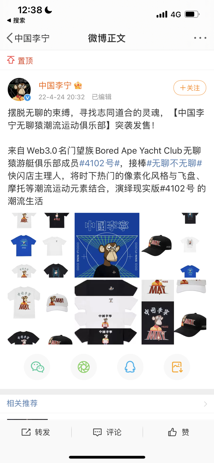 4月28日,运动品牌李宁也在微博上宣布,拥有了编号#4102的主理猿。这是上万个无聊猿猴NFT作品之一。