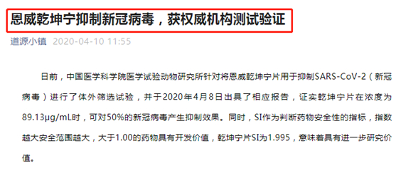 2020年4月10日,微信公众号道源小镇发布《恩威乾坤宁抑制新冠病毒,获权威机构测试验证》文章,内容声称:根据中科院动物研究所实验报告结果显示,成人每天内服0.64克乾坤宁片,能直接对病毒进行抑制。