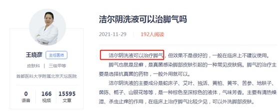 2021年11月29日,宣称是权威三甲医院专家健康科普教育平台的妙手医生网站,来自首都医科大学附属北京天坛医院的主任医师王晓彦回答提问时表示,洁尔阴洗液可以治疗脚气。