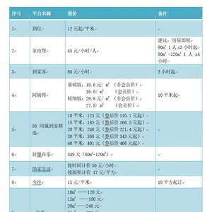 其中到位、家政帮、助家生活的收费相对较低,基本在每平方米在5-10元之间;
