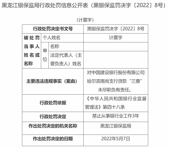 建设银行哈尔滨南岗支行贷款三查未尽职 三人被处罚