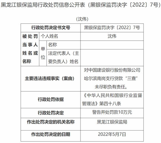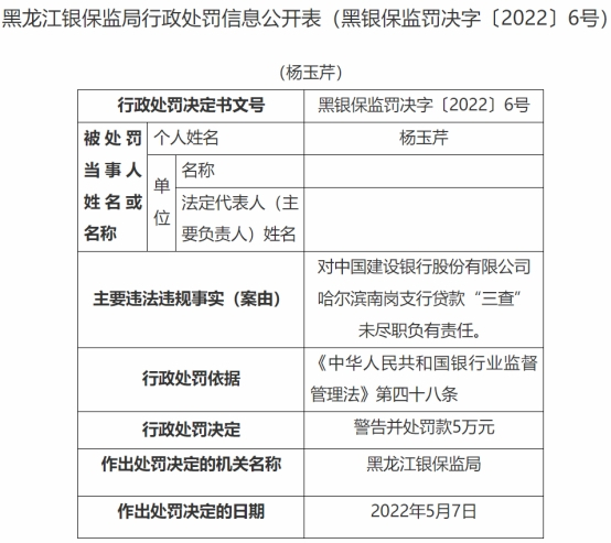 中国经济网北京5月12日讯 中国银保监会网站今日公布的黑龙江银保监局行政处罚信息公开表(黑银保监罚决字〔2022〕6号、7号、8号)显示,杨玉芹、沈伟、计震宇三人对中国建设银行股份有限公司哈尔滨南岗支行贷款“三查”未尽职负有责任。