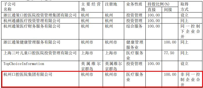 通策医疗股份有限公司(简称“通策医疗”,600763.SH)年报显示,杭州口腔医院集团有限公司为其间接持股100%的子公司。