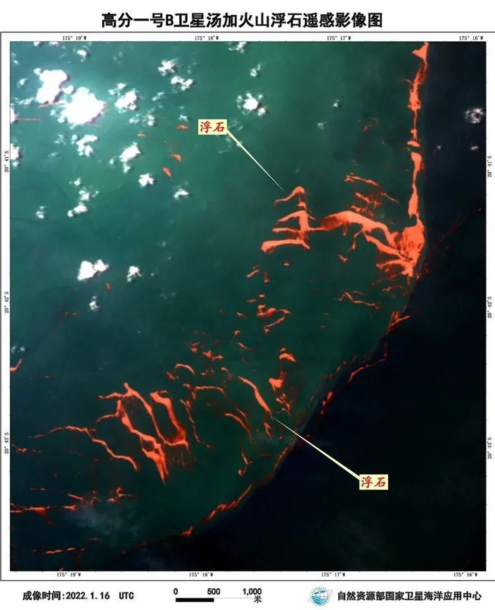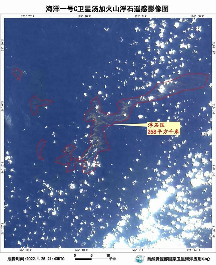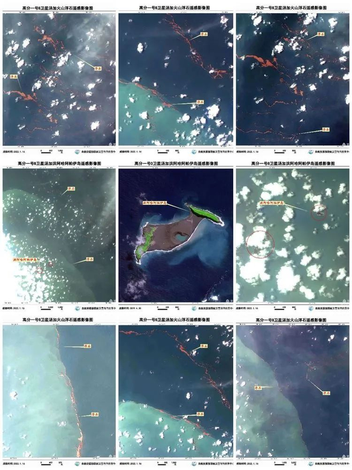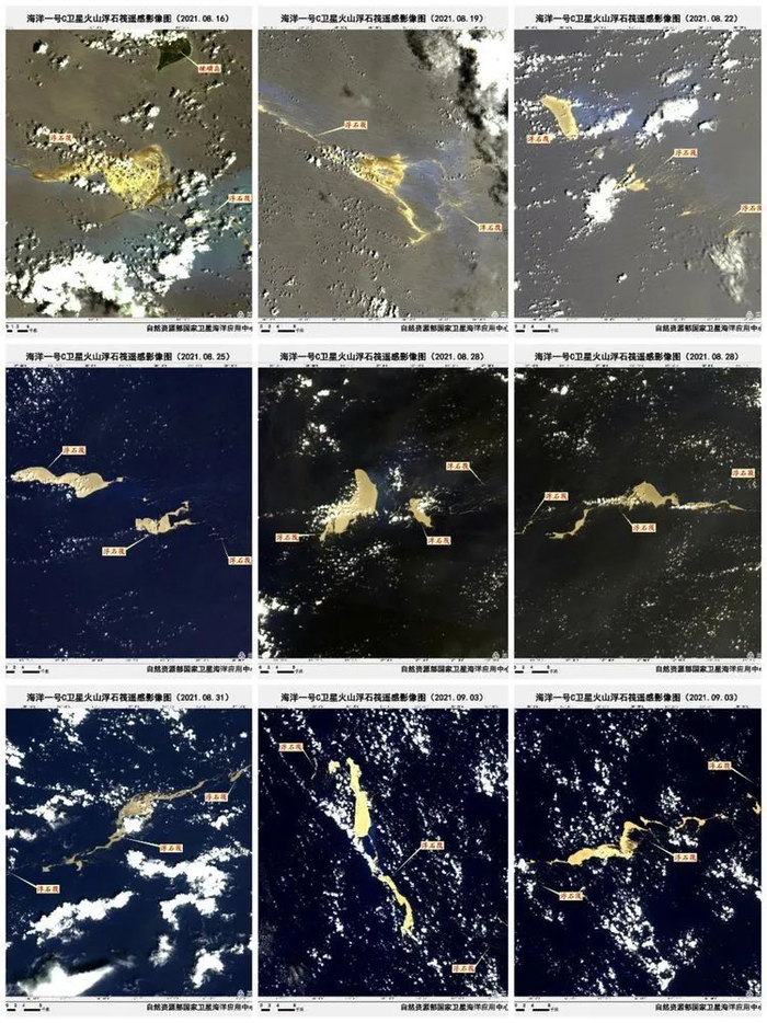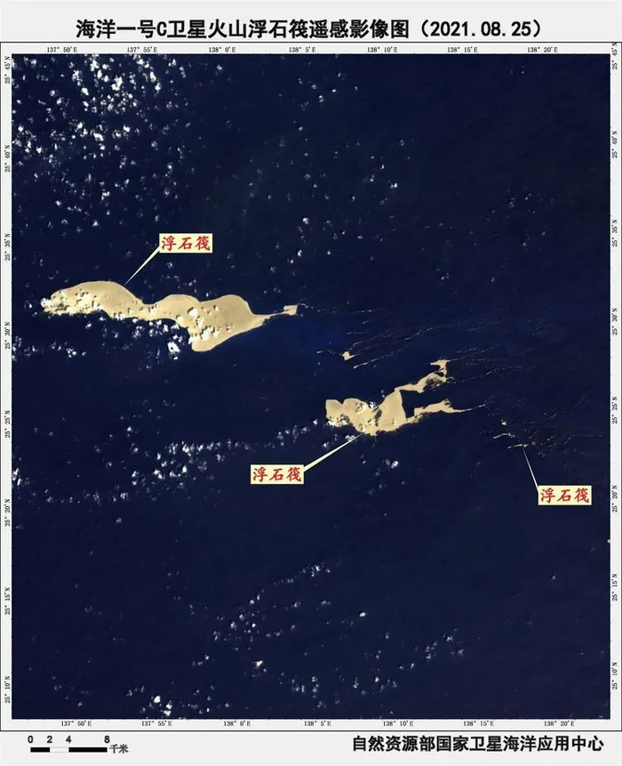 今年1月15日,汤加海域洪阿哈阿帕伊岛火山猛烈喷发;2021年8月13日,位于日本本州岛以南1050千米的硫磺岛以南50千米海域的日本福德冈之场海底火山发生喷发,两次火山喷发均产生了大量的火山浮石。火山浮石是由火山熔岩和海水接触产生的一种矿物质,主要成分是二氧化硅,质地软、比重小,因此会长时间漂浮在海面上,并随着洋流向西漂流,影响航行安全和生态环境。国家卫星海洋应用中心利用HY—1C/D卫星以及高分卫星进行了监测,制作了一系列专题图像,及时提供给了相关应急机构。