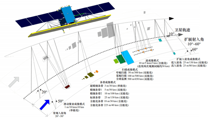 海陆雷达系列卫星用于全球海洋和陆地信息的全天候监视监测,配置C波段合成孔径雷达和船舶自动识别系统,用于海洋、减灾、水利及气象等多方面。C波段合成孔径雷达具有聚束、条带、扫描、波模式等12种成像模式,空间分辨率在1米~500米之间,幅宽为10千米~650千米。工作频段为C波段(5.4GHz),常规入射角为20º~50º,扩展入射角为10º~20º或50º~50º。可全天候监测台风、海冰、绿潮、溢油、地震前后变化、滑坡与堰塞湖等自然灾害。
