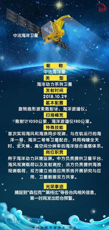 CFOSAT卫星为中法两国合作的科研试验卫星,主要任务是获取全球海面波浪谱、海面风场、南北极海冰信息,提高对巨浪、海洋热带风暴、风暴潮等灾害性海况预报的精度与时效,同时获取极地冰盖相关数据,为全球气候变化研究提供基础信息。配置海浪波谱仪(SWIM)、扇形波束散射计(CSCAT)两个全新载荷。SWIM是国际上首次采用六波束真实孔径雷达方式连续测量全球海面波浪谱的卫星遥感载荷,CSCAT首次采用扇形波束天线,可以与海洋波谱仪实现观测角的互补,首次实现风浪同时探测。