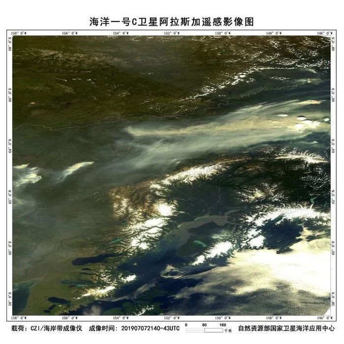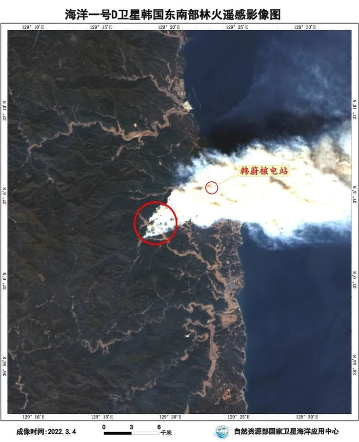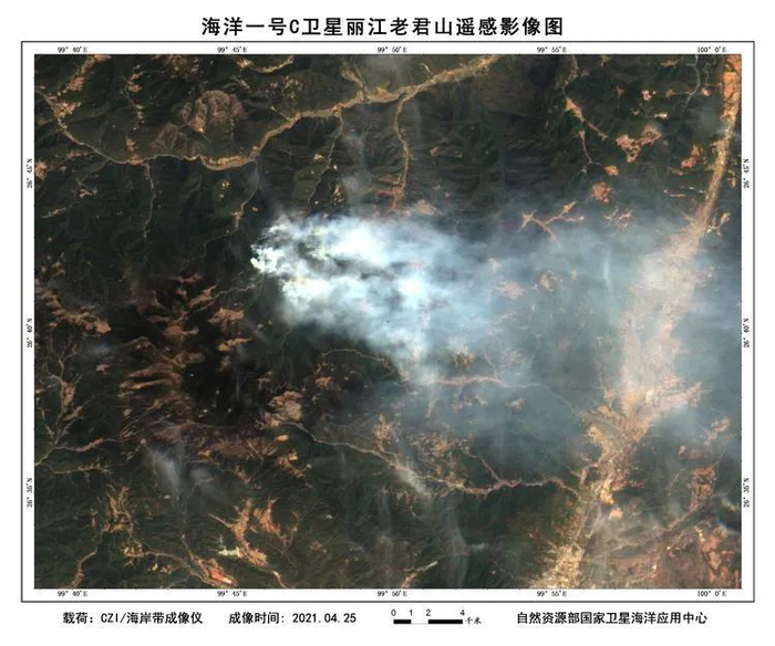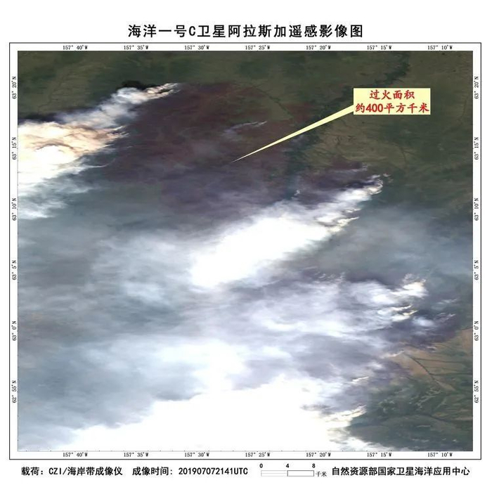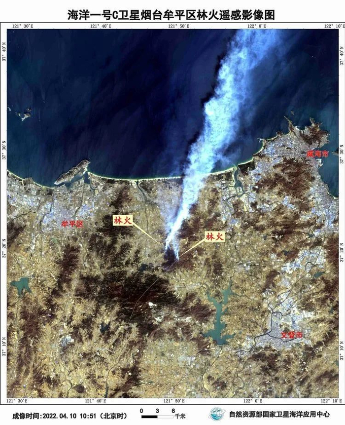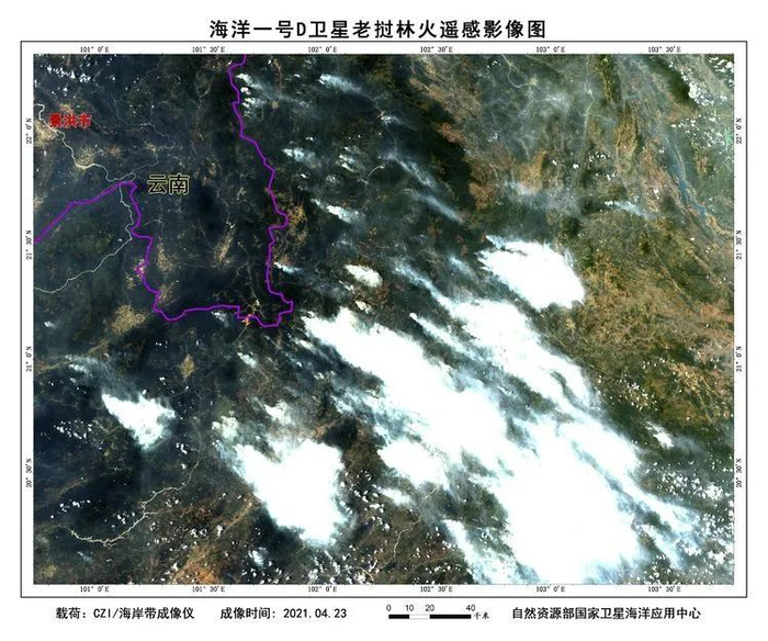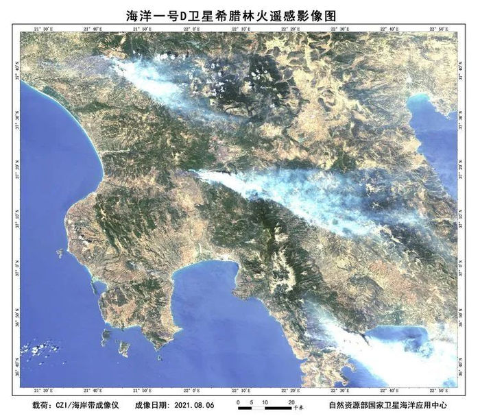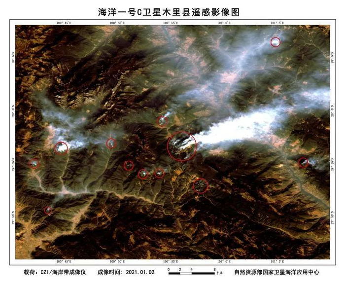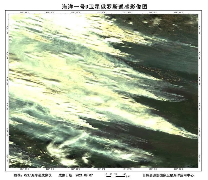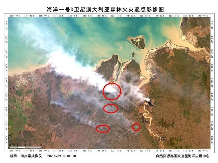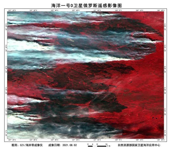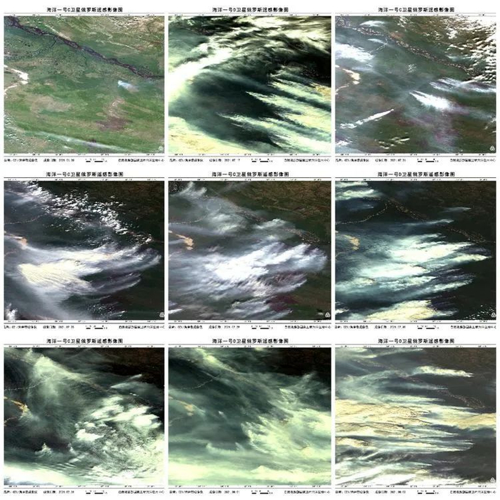 HY一1C/1D卫星在轨交付以来,发现多个国家以及中国多个城市每月都有各种森林火灾出现。火灾发生时常伴随长距离的、淡蓝色或淡黄色的浓烟,无论是在海洋水色水温扫描仪图像还是在海岸带成像仪的图像分析,其特征明显,烟雾与云层可通过形状及阴影特征区分开,火灾发生后其辐射值与周边有明显的差异,植被指数发生明显变化,特别是海洋水色扫描仪每天一次覆盖和3天一次覆盖,用火灾发生前最近图像做比对就更容易判断。大面积的火与小面积的火灾没有云覆盖条件下一般都能发现,发现之后再找前3天或6天图像比对,可计算过火面积。在俄罗斯、澳大利亚、巴西、印尼、美国、缅甸、老挝、蒙古等国以及我国青岛、烟台、高密以及重庆、云南、山西、广东、广西、四川、江西、北京等地发生火灾时,中心利用HY一1C/1D卫星进行应急监测,其数据与产品及时提供给了相关部门。