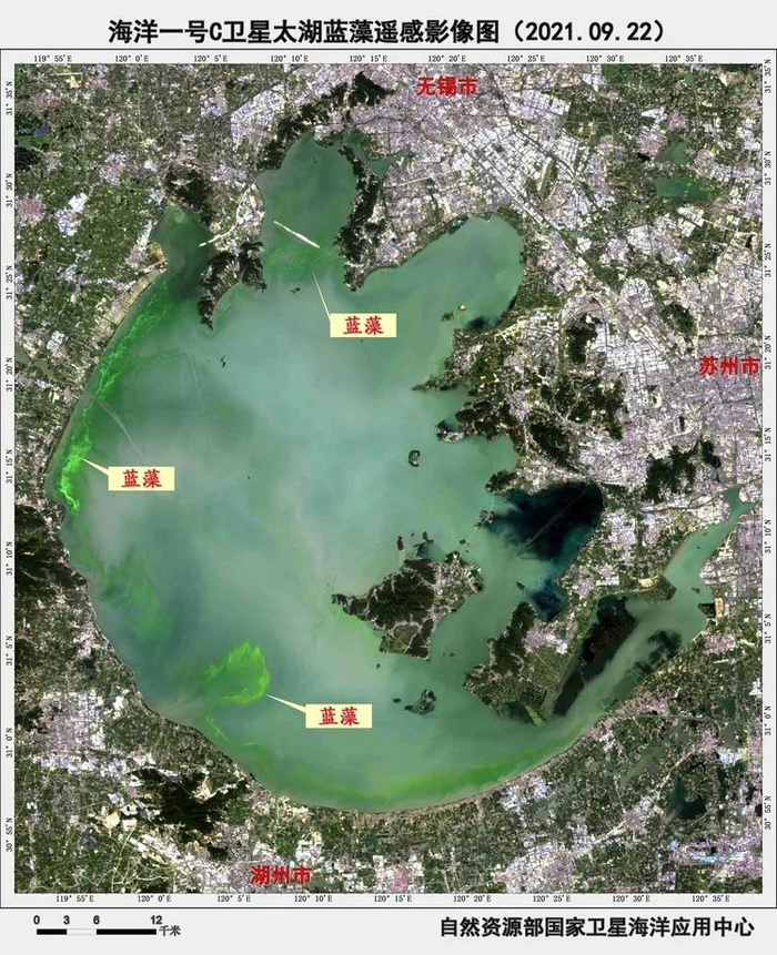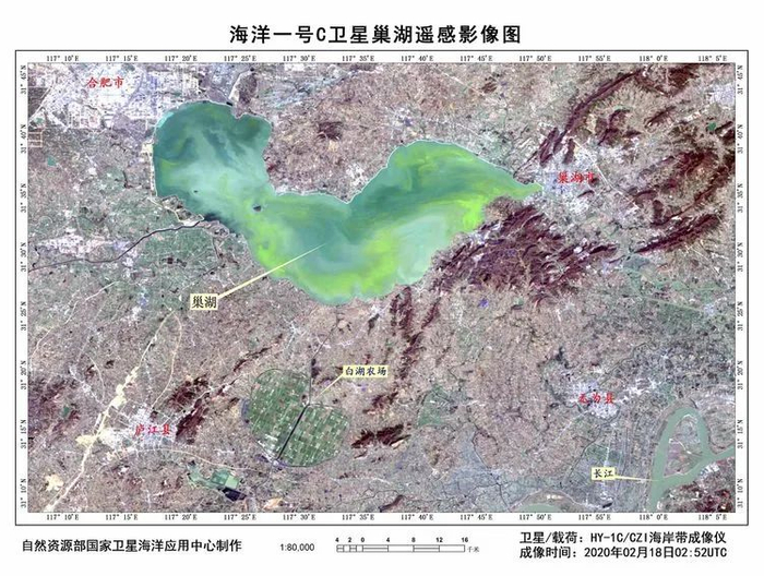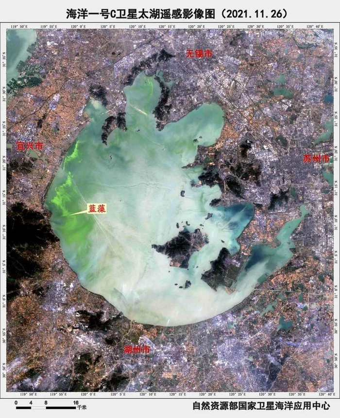 经济社会发展速度过快,导致工业、农业污染以及城市生活废水、污水增多,这些废水未达到排放标准进入江河湖泊,造成水体富营养化。在适宜的温度条件下,蓝藻大量繁殖,严重影响饮用水源与生活用水,蓝藻的恶臭也影响人们自由呼吸。利用HY一1C/1D卫星海岸带成像仪监测到太湖、巢湖、洱海蓝藻频发,及时提供给有关部门,为地方政府的蓝藻综合治理提供了依据。