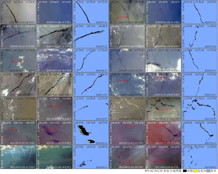 HY一1C/1D卫星对中国近海溢油具有大范围、高频次、动态监测能力,能识别不同溢油污染类型及面积,有利于溢油污染类型判定,为中国海洋环境监测提供可靠卫星数据支持,基于HY一1C/1D卫星CZI载荷近3年观测数据,对中国近海及相关海域开展溢油光学遥感监测与分析,近3年来共监测到溢油事件57次,同时利用GF一3卫星对海上溢油事件进行了多次监测。