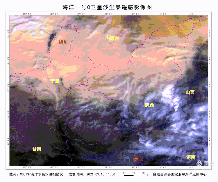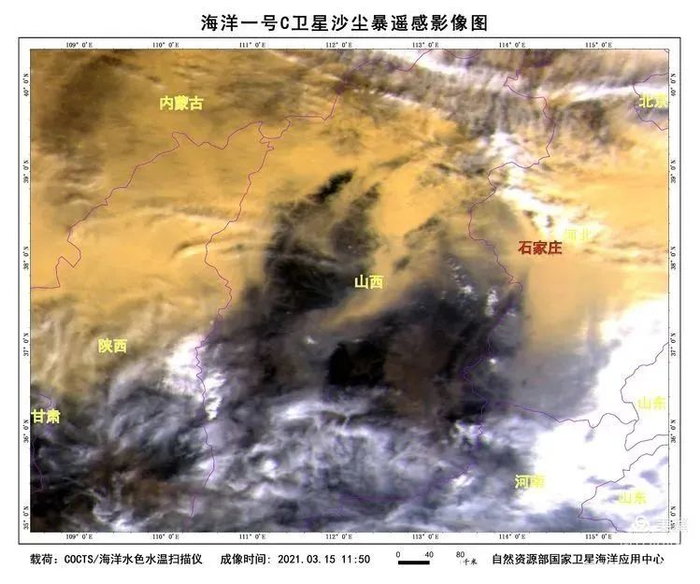 沙尘暴究竟从哪来?影响多大区域?往哪去?通过海洋一号卫星图像可以得到答案。海洋一号卫星海洋水色水温扫描仪扫描幅宽3000公里,双星组网后,白天可见光与红外通道可以覆盖两次,可捕捉沙尘暴日变化过程。2021年3月15日出现的沙尘暴覆盖区域超出想象,北京、天津、内蒙古、新疆、甘肃、宁夏、陕西、山西、河北、山东,辽宁、吉林、黑龙江等省份都有沙尘暴,而在3月14日下午HY一1D卫星海洋水色水温扫描仪图像上只有蒙古国部分区域有沙尘暴。本次沙尘暴长度超过3000公里,最宽超过500公里。与2020年6月海洋一号卫星监测到的撒哈拉沙漠产生的沙尘暴相当,那一次影响的长度超过2700公里,最宽处超过1200公里。